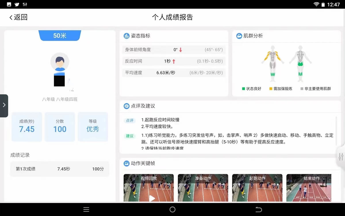 图为AI智慧操场“电子考官”为八年级学生50米短跑考试项目 实时生成的个人成绩报告,可大大减少老师们的成绩统计时间、人力成本,提高考试工作效率。